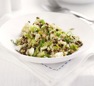 3.Stir the softened shallot and tarragon into the cooled quinoa along with the lentils, cucumber, feta, spring onions, orange zest and juice and vinegar. Toss well together and chill until ready to serve.